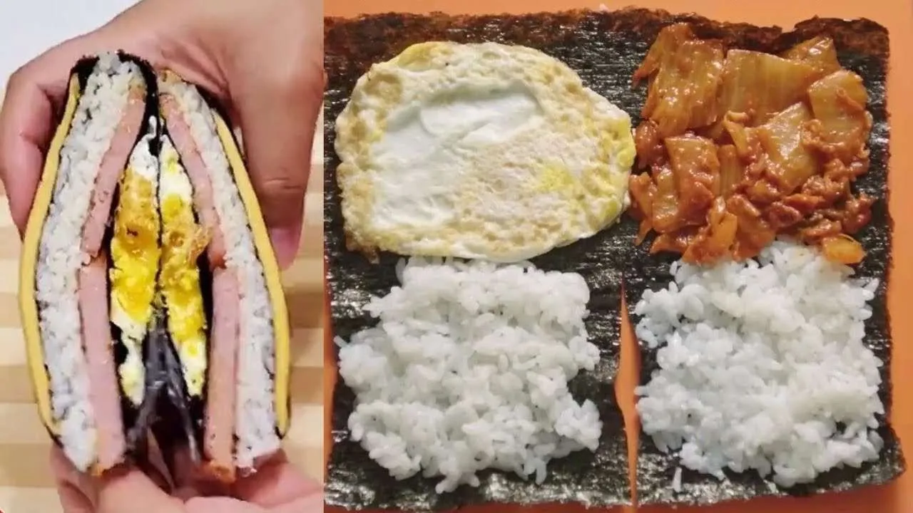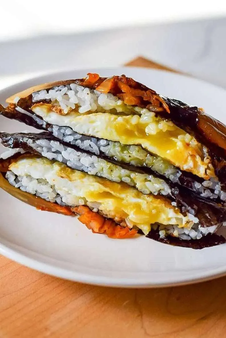 - Akhir sekali, boleh mula melipat bahagian kimbap tersebut bermula dengan bahagian nasi, ke telur, kimchi dan akhirnya ditutup ke bahagian nasi yang terakhir. Pastikan kimbap dilipat sebaiknya supaya isinya tidak terkeluar apabila dimakan.